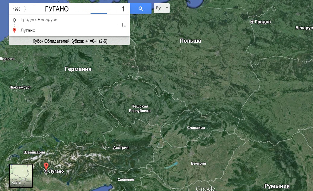 Геаграфія афіцыйных сустрэч жоўта-зялёных досыць шырокая. Гродзенскія футбалісты за сваю гісторыю ступалі на зялёныя футбольныя газоны Украіны, Літвы, Латвіі, Эстоніі, Малдовы, Расіі («Поўнач» Мурманск - 1 770 км; 11 гульняў на полі суперніка), Грузіі, Арменіі, Азербайджана («Аўтамабіліст» Баку - 2 450 км; 1 гульня), Таджыкістана, Узбекістана, Казахстана, Туркменістана і Кыргызстана (тады гэта ўсё былі саюзныя рэспублікі), а таксама Ісландыі, Румыніі, Чэхіі і Швейцарыі («Лугана» Лугана - 1 363 км; 1 гульня).
