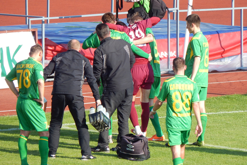 Нападнік бабруйчан у падзенні цягнуўся нагой да сыходзячага мяча, а брамнік самааддана кінуўся напярэймы. У выніку гулец гаспадароў заехаў нагой у твар нашаму галкіперу. Пасля гэтага сутыкнення Курганскаму патрэбна была дапамога дактароў і брамніка павезла карэта хуткай дапамогі ў гарадскую лякарню горада.