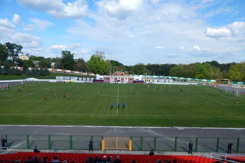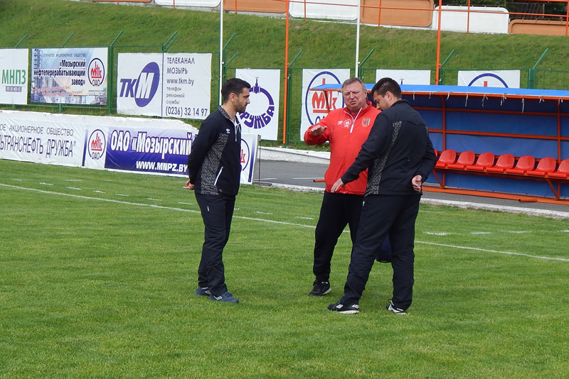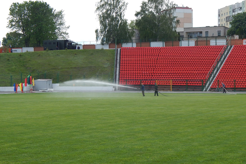 У Мазыры зараз футбольная надвор'е. Нягледзячы на сонца, якое перыядычна хаваецца за аблокі, на полі традыцыйна ветрана. Поле перад матчам паліваюць з пажарных гідрантаў.