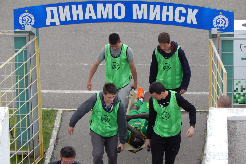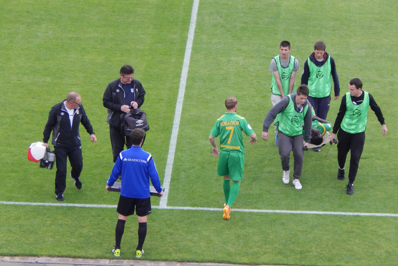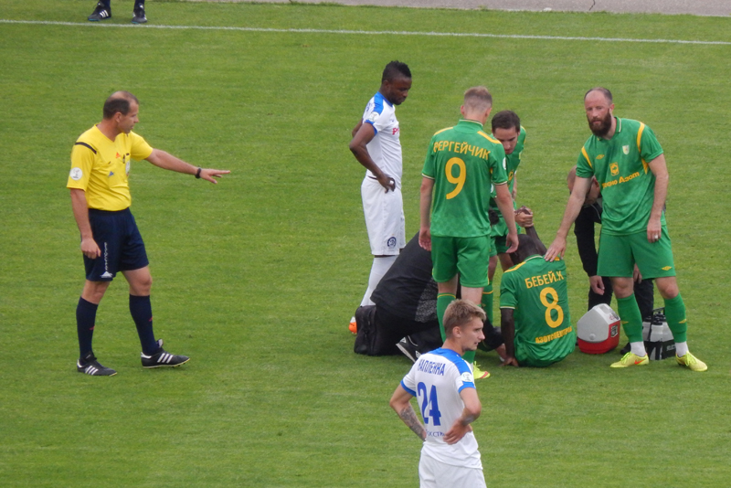 Ну што ты будзеш рабіць!!! У цэнтры поля траўму атрымлівае Бебе. Лекары на поле, гульцы паказваюць, што патрабуюцца насілкі.