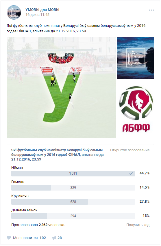 Усяго ў фінальным галасаванні прынялі ўдзел 2 262 чалавекі, з іх 1 011 аддалі галасы нашаму клубу. Адрыў ад «Крумкачоў», якія размясціліся следам за жоўта-зялёнымі склаў каля 17 адсоткаў. Дзякуй усім, хто заўважыў нашу сціплую працу ў гэтым кірунку і прагаласаваў за нас.