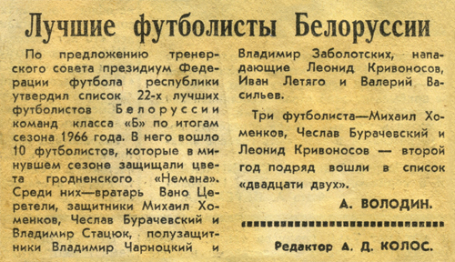 1967 – победитель переходного турнира за право выступать во второй группе класса «А» («Неман» Гродно)