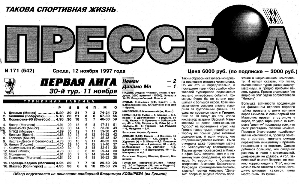 Так получается, что из 13 наших побед, если брать в расчёт игры в чемпионате и кубке страны, 9 гродненцы добыли в столице. На домашнем стадионе «Неман» побеждал минчан только 4 раза. Первый такой случай был зафиксирован 11 ноября 1997 года, правда победный гол Виталия Таращика удалось рассмотреть далеко не всем. Виной тому был густой туман, из-за которого чуть было тот матч не был отменён. Минчане тогда приехали в Гродно в ранге чемпиона и особо не усердствовали – победа гродненцев со счётом 2:1 (Ю.Мазурчик, В.Таращик). Тот матч, кстати, также показывало телевидение.