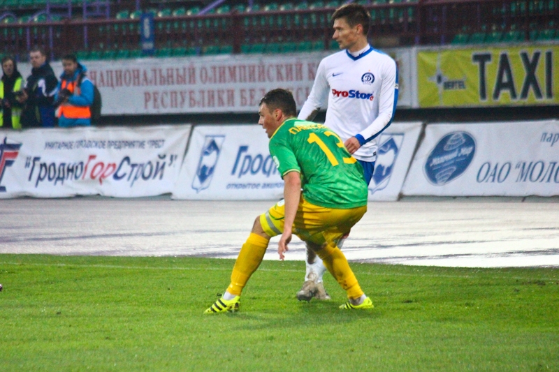 Оправившись от удара, гродненцы стали накатывать на ворота Игнатовича. Опасность то и дело стала возникать после фланговых проходом жёлто-зелёных. После прострела Рудика по мячу не попал Бомбель, а Савицкий в двух атаках пробил прямо во вратаря. Немного не хватило Рудику, чтобы переправить мяч в сетку после подачи углового – Филипп чуть-чуть не дотянулся до него. Казалось, что ещ чуть-чуть и второй мяч влетит в сетку ворот минчан. Получилось всё наоборот. На 27-й минуте Габовда с Бегуновым отобрали мяч у Анюкевича, Нойок его подхватил и вернул в край Габовде. Украинец легко разобрался с Савостьяновым, прокинув мяч ему между ног и прострелил в штрафную. Расторопнее всех в этой атаке оказался Хващинский, головой с близкого расстояния переправив мяч в сетку – 1:2. Через десять минут минчане в третий раз огорчили Курганского. После подачи углового по воротам головой пробил Челядинский, но вратарь с первым ударом защитника динамовцев справился, а вот с его же добиванием, нет. Мяч от перекладины опустился за линию ворот – 1:3. Не успела гродненская публика погоревать, как жёлто-зелёные отыграли один мяч. Лешко подал в штрафную, Васьков головой сбросил мяч в центр, а Бомбель удачно подставил ногу и в касание отправил мяч в девятку – 2:3!