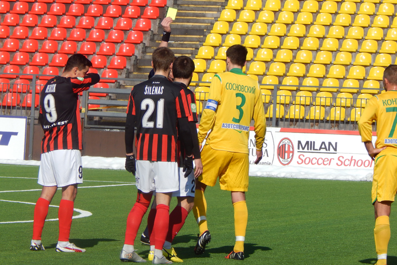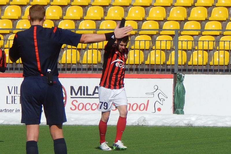 На 32-й минуте встречи случился эпизод с удалением лучшего бомбардира «Тракая» нынешнего сезона. Сосновский в очередной раз отобрал мяч у полузащитника, а тот, оказавшись на газоне, ударил по ногам убегавшего гродненского капитана. Стычка, красная зачинщику и предупреждение Сосновскому. Судья быстро остудил горячие головы футболистов и не утерял нить игры. Вместо удалённого с поля Вальскиса вышел Дапкус. Удаления с правом замены – так было договорено перед началом матча.