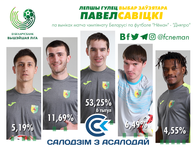 Лучший игрок матча «Неман» — «Днепр» (номинанты): 1. Савицкий (53,25%) - 2. Кантария (11,69%) - 3. Журов (6,49%).