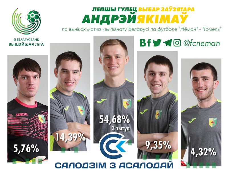 Лучший игрок матча «Неман» — «Гомель» (номинанты): 1. Якимов (54,68%) - 2. Савицкий (14,39%) - 3. Яблонский (9,35%).