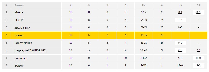 До этого матча у наших было всего 4 пропущенных мяча в 10 матчах, но сегодня этот показатель значительно ухудшился. Несмотря на столь неудачный результат в этом матче, жёлто-зелёные продолжают борьбу за призовые места. После 11 тура «Нёман» имеет одинаковое количество очков с минчкой «Звездой-БГУ» и делит с ними третье место. На четыре очка опережает этот дуэт ещё одна столичная команда РГУОР, которая идёт в чемпионате второй.