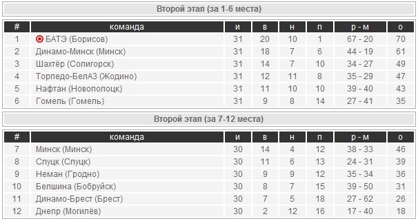 Вчера первая шестерка сыграла свои предпоследние матчи в чемпионате. В бронзовом матче «Шахтёр» - «Торпедо-БелАЗ» была зафиксирована ничья, а значит борьба за третье место продолжится до последней минуты первенства. В нашей группе сыграют команды расположившиеся на двух верхних строчках, однако на лидирующее положение «Минска» результат этого матча не повлияет. Столичная команда уже никому не отдаст свое седьмое место.