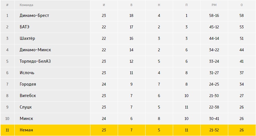 Статистика домашних матчей «Немана»: +1=5-5 (мячи 5-12). Домашние игры в этом сезоне складываются для команды неудачно. Единственная домашняя победа случилась в 4 туре чемпионата, после которой наша команда уже 9 матчей подряд не может порадовать своего болельщика. Дома жёлто-зелёные играют гораздо хуже, чем на выезде - 1 победа и 8 набранных очков в Гродно, против 6 побед и 18 набранных очков на полях соперника.