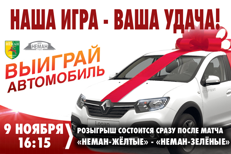 9 ноября 2019 года на главной арене ЦСК «Неман» для вас сыграют два состава нашей команды. Матч Жёлтых против Зелёных начнётся в 16:15, а розыгрыш автомобиля состоится сразу же после окончания встречи.