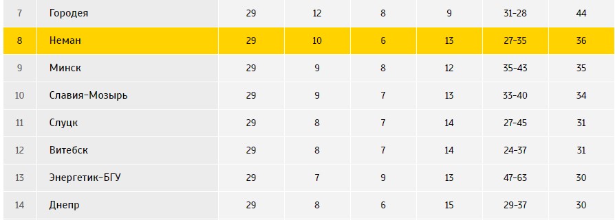 В дебютном сезоне в Высшей Лиге «Слуцк» занял 9-е место («Неман» был 8), в 2015 - 11 («Неман» - 8), в 2016 - 12 («Неман» - 14), 2017 - 7 («Неман» - 6), 2018 - 8 («Неман» - 7). Как видите, показатели наших команд похожи из года в год. Вот и в этом сезоне наш сегодняшний соперник перед последней встречей находится чуть ниже жёлто-зелёных: у гродненцев 36 очков и 8 место, а у случчан - 31 очко и 11 место в турнирной таблице.