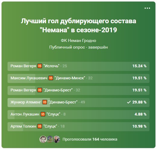 По итогам голосования лучшим голом сезона 2019 года у дублёров признан гол в исполнении Жуниора Атеменга в матче против дубля минского «Торпедо» (33,92%: 45,00% камерунец получил от читателей сайта / 29,88% от подписчиков группы Вконтакте).