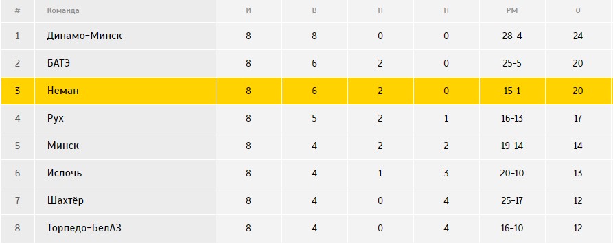 Диспозиция перед встречей дублирующих составов (полная таблица): «Неман» - 3 место (20 очков, мячи 15-1), «Шахтёр» - 7 место (12 очков, мячи 25-17).
