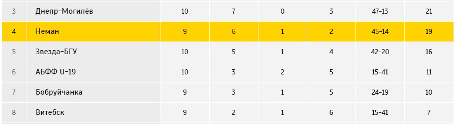 Диспозиция перед встречей (полная таблица): «Неман» – 4 место (19 очков, 45-14), «Витебск» – 8 место (7 очков, 15-41).
