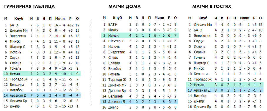 Атака команд: «Неман» - 9 забитых мячей в 7 играх чемпионата (8-9 место в лиге по забитым командой мячам, в среднем команда забивает 1,29 мяча за одну игру), «Арсенал» забил всего 4 мяча в 7 встречах (15 место в чемпионате, в среднем команда забивает 0,57 мяча за одну игру).