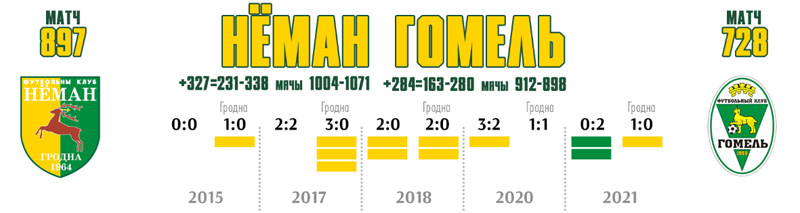 В сильнейшем дивизионе команды отыграли вместе уже 26 сезонов. За это время в рамках чемпионата соперники встретились между собой 53 раза. Общие цифры противостояния на сегодняшний день в пользу гродненцев: +21=14-18, разница мячей 59-54. Это преимущество добыто именно на своём поле: +13=8-6, мячи 37-23. Если учитывать официальные матчи чемпионата СССР (+22=12-14, мячи 57-39) и Кубка Беларуси (+3=1-1, мячи 11-8), то преимущество жёлто-зелёных будет ещё более значительным: +46=27-33, мячи 127-101.