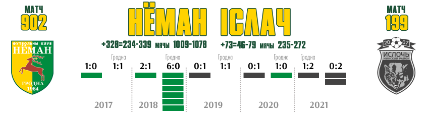 Начиная с 2016 года команды встречаются в рамках чемпионата дважды за сезон. За это время соперники провели между собой 13 матчей: +5=4-4, разница мячей 16-11. В матчах сыгранных в Гродно статистика противостояния с пристоличной командой выглядит следующим образом: +3=2-1, мячи 12-5. Во всех без исключения предыдущих домашних матчах гродненцы забивали «Ислочи», а самый результативный для нашей команды состоялся в сезоне 2018 года. Жёлто-зелёные на своём поле разгромили гостей со счётом 6:0.