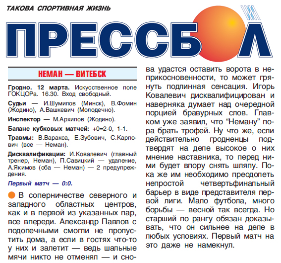 - НЕМАН — ВИТЕБСК – 2 : 1 (0 : 0)