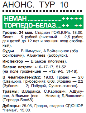 В матче 10-го тура «Беларусбанк — чемпионата Республики Беларусь по футболу среди команд Высшей Лиги» жёлто-зелёные в родных стенах принимают одного из лидеров чемпионата жодинское «Торпедо-БелАЗ». Игра состоится в среду, 24 мая, на главной футбольной арене города и начнётся в 18:00.