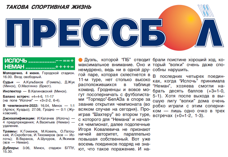 2022. «Неман» - 9 место, «Ислочь» - 5 место. Матч в Минске - 1:1 (С.Х.Куадьо 80 - М.Артюх 65), матч в Гродно - 1:0 (В.Жуковкий 45).