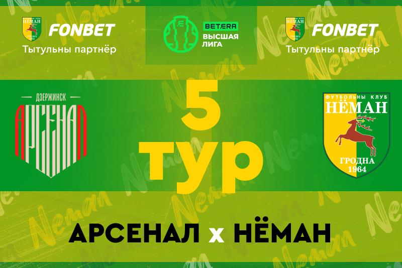 В матче 5-го тура «Бетера — чемпионата Республики Беларусь по футболу среди команд Высшей Лиги» гродненский «Неман» в Минске встречается с дзержинским «Арсеналом». Матч пройдёт сегодня на стадионе РЦОР по футболу, который находится на улице Семашко и начнётся в 15:45.