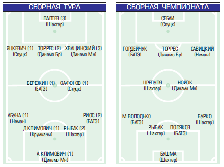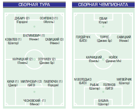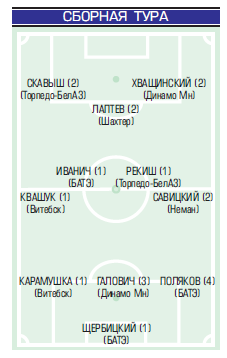 Впервые в сборную тура «Прессбола» попал Владислав Климович, в третий раз - Павел Савицкий. Капитан гродненцев теперь входит в сборную чемпионата.