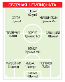 Вратарь – Родион Сямук (Славия-Мозырь), защитники – Олег Карамушка (Витебск), Алексей Янушкевич (Шахтер), Нино Галович (Динамо-Минск), полузащитники – Дмитрий Рекиш (Торпедо-БелАЗ), Мирко Иванич (БАТЭ), Максим Бабичев (Витебск). Валерий Жуковский (Неман), Геннадий Близнюк (Ислочь), нападающие – Владимир Хващинский (Динамо-Минск), Максим Скавыш (Торпедо-БелАЗ).
