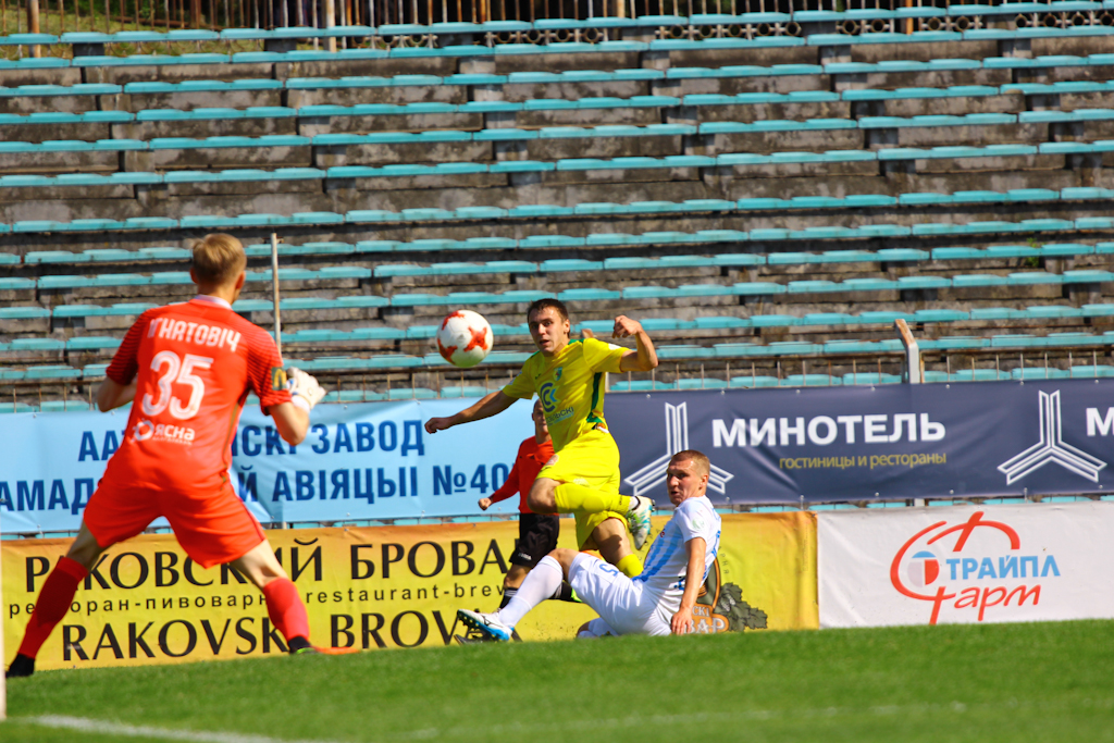 49' | 1-1 | - неплохая атака получилась у гостей после перехвата Горбача в центре поля. Якимов сделал верховую передачу с левого фланга атаки на дальнюю штангу на Концевого. Нападающий завис в воздухе и головой пробил в дальний угол, но Игнатович в прыжке мяч отбил. К тому же боковой в этой атаке гродненцев усмотрел вне игры