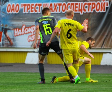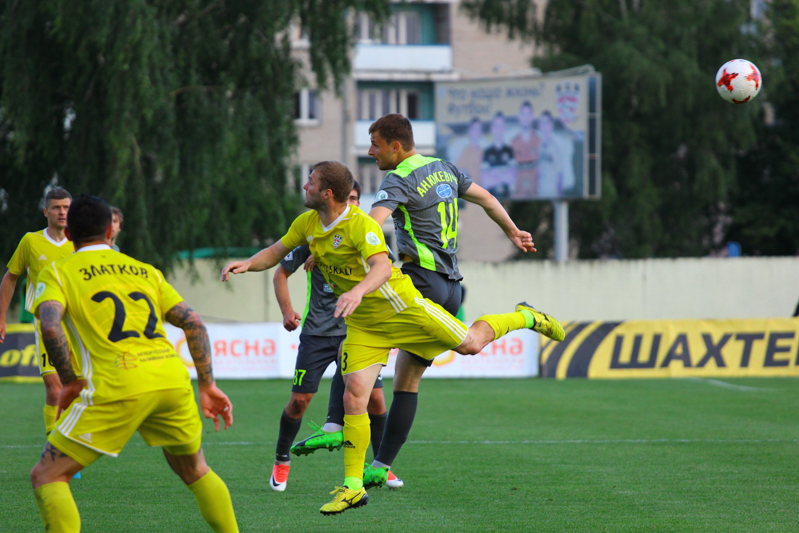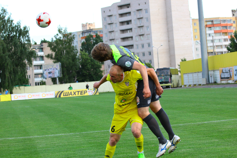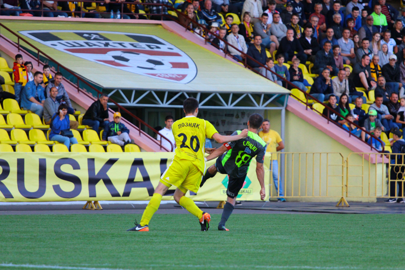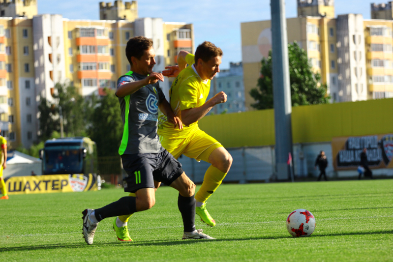 Гродненцы до перерыва играли с лидером на равных. Комбинировали, подолгу разыгрывали мяч, однако близко к владениям Бушмы так и не подобрались. Несколько дальних ударов в исполнении Жуковского и Рудика, да удар через себя после красивой комбинации Зубкова заставили публику взволнованно выдохнуть. А в остальном шла тяжёлая борьба двух равных коллективов, в которой преуспевала оборона. Златков с Рыбаком прерывали практически все верховые передачи-забросы, не позволив нашему невысокому единственному нападающему Хлебосолову, как следует встретиться с мячом. Дмитрий бился, вгрызался в мяч, но защита «Шахтёра» работала слаженно, удачно страхуя друг друга при небольших помарках. В перерыве тренерский штаб заменил Хлебосолова на Климовича, в надежде, что тот сможет впереди зацепиться за мяч. Однако после перерыва гродненцам пришлось в основном обороняться, пытаясь сохранить ничейный результат.