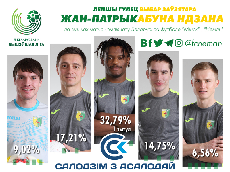 Лучший игрок матча «Минск» — «Неман» (номинанты): 1. Абуна Ндзана (32,79%) - 2. Жуковский (17,21%) - 3. Савицкий (14,75%).