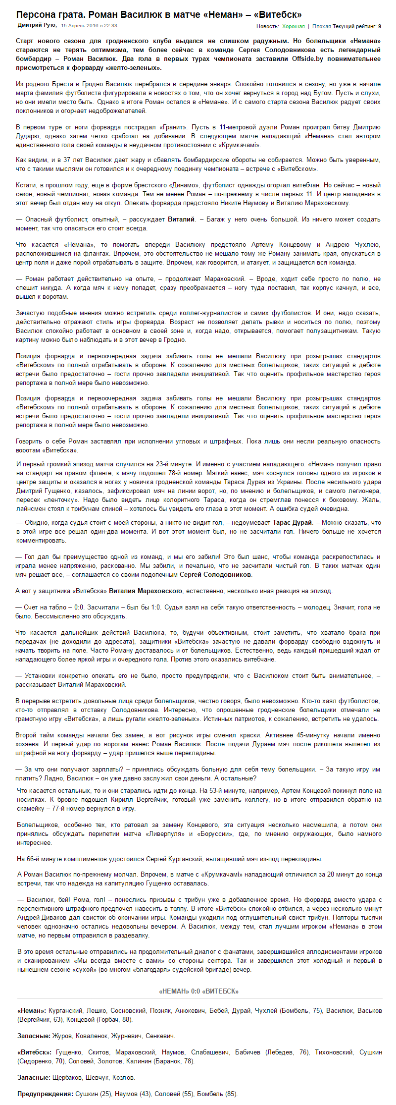 В третьем кряду матче с «Витебском» наша команда никак не может подобрать к их воротам ключи. Противостояния соперников проходят в жёсткой борьбе, при огромном количестве единоборств, но при минимальном количестве угроз воротам друг друга. В основном все удары по воротам пятничным вечером были нанесены из-за пределов штрафной, малая толика которых была направлена в створ. Гущенко спас свои ворота, если можно так сказать, один раз до перерыва, а Курганский отвёл угрозу после опасного удара Золотова во втором. Все остальные моменты и угрозы были не столь значительными. Немного оживили в концовке игру замены. Активно, с азартом вошли в игру Вергейчик и Бомбель. Последний за отведённое ему время дважды успел пробить по воротам. Артур своей заряженностью на ворота противника , которую он показывает выходя на замену, вполне заслужил себе место в основном составе.