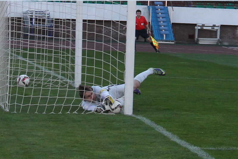 Гущенко среагировал и в прыжке мяч достал… из-за линии ворот и быстренько ввёл его в игру. Боковой арбитр рассмотреть эпизод был не в состоянии – Гущенко перекрывал тому обзор, а вот Диваков момент видел.